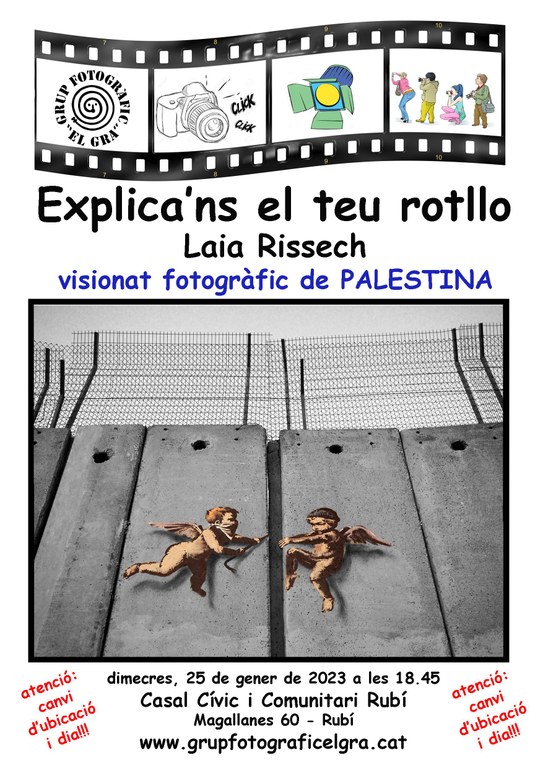 Mitjançant les fotografies de la Laia Rissech, fetes algunes assumint certs riscos a causa del meticulós control del govern israelià, volem tornar a parlar d’un poble maltractat, perseguit i assassinat, amb tota impunitat davant ells ulls del món. Les seves imatges ens parlen tant del conflicte com de la quotidianitat del poble palestí i dels seus veïns jueus.