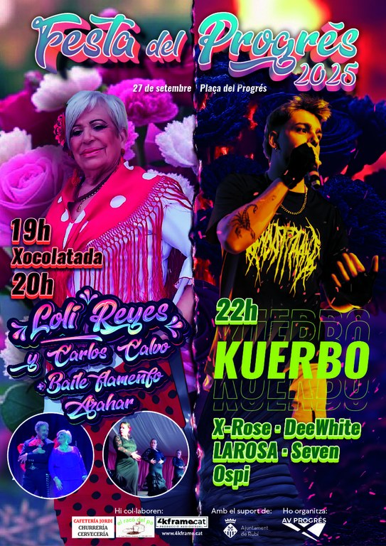 La festa començarà amb una xocolatada popular, seguida de l'actuació de Loli Reyes i Carlos Calvo amb la companya de Baile Flamenco Azahar. La nit continuarà amb la música urbana de Kuerbo, X-Rose, DeeWhite, LAROSA, Seven i Osp.