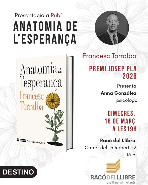 L’autor conversarà amb la psicòloga rubinenca Anna González Serrano. Una immersió lúcida i esperançadora en la força que ens manté dempeus quan tot sembla perdut. Què fa que alguns éssers humans s’aixequin cada vegada que cauen mentre que d’altres s’enfonsen en el desencís? On neix aquesta força misteriosa que, malgrat tot, ens empeny cap endavant? A partir de la filosofia, la literatura i l’experiència humana, Torralba explora els mecanismes que sostenen l’esperit quan tot sembla perdut. Amb una prosa clara i fonda, mostra com es construeixen horitzons, com reneix el sentit i per què necessitem, més que mai, aquesta confiança indestructible que ens manté dempeus malgrat tot.