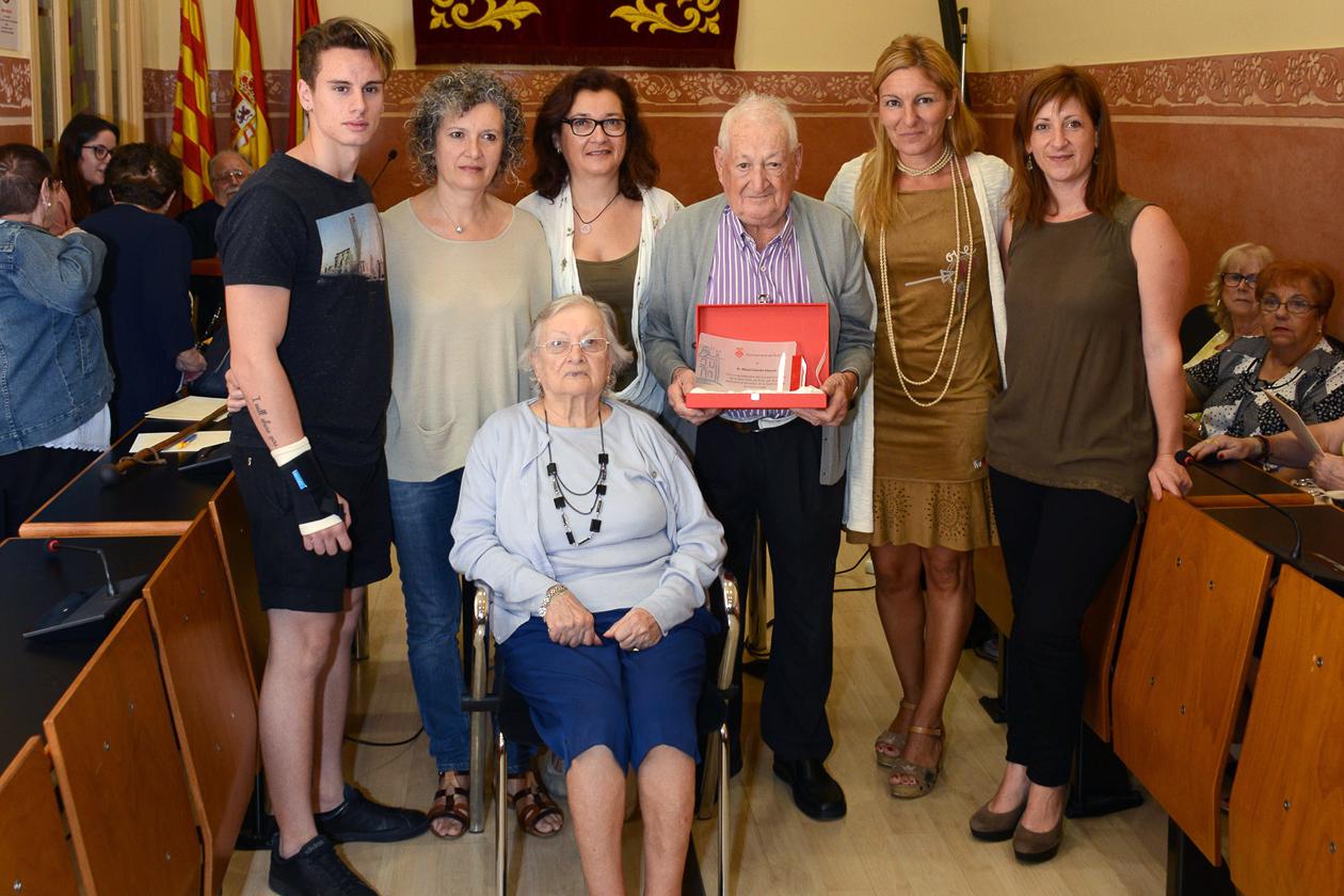 El Miquel Galofré acompanyat de la seva família, amb l'alcaldessa i la regidora (foto: Localpres)