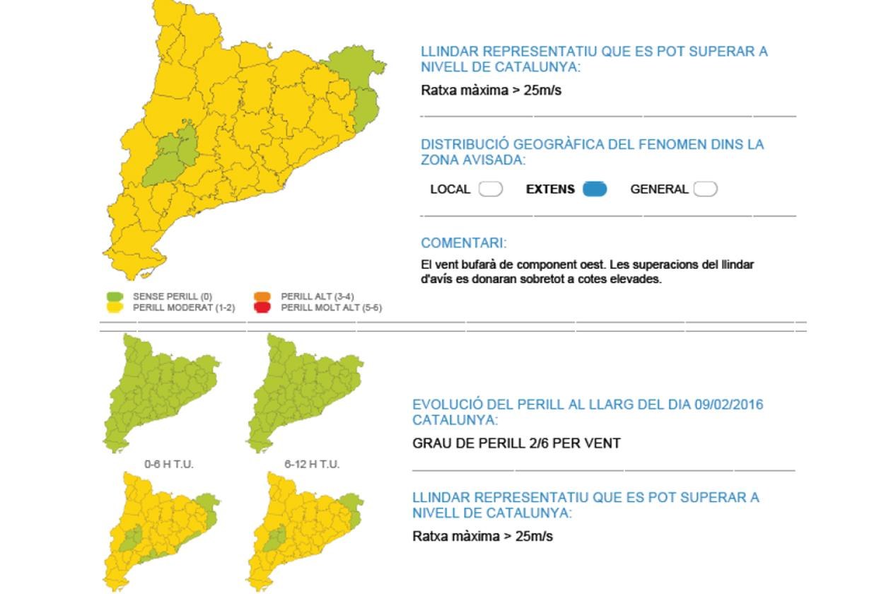 Davant d’aquesta previsió, s’ha iniciat la situació de prealerta del Pla de Protecció Civil de Catalunya (PROCICAT) i es recomana a la ciutadania que tingui cura amb aquells elements que puguin quedar inestables com a conseqüència del vent.