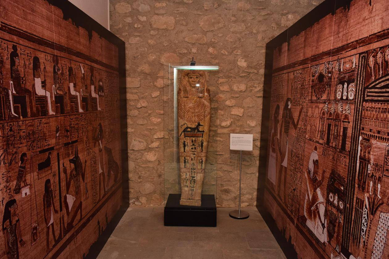 Aquesta coberta de taüt, del Període Ptolemaic, s'ha muntat en un espai que imita l’hipotètic interior d’una tomba (foto: Localpres)
