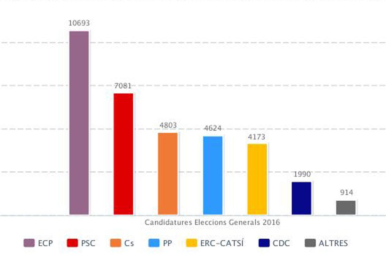 Un total de 10.693 electors rubinencs han votat la candidatura En Comú Podem (ECP) a les eleccions generals d'aquest diumenge. Amb un 30,96% dels vots, la coalició que integren Podem Catalunya, Iniciativa per Catalunya Verds (ICV), Esquerra Unida i Alternativa (EUiA) i Barcelona en Comú, ha repetit com a força més votada a la ciutat.