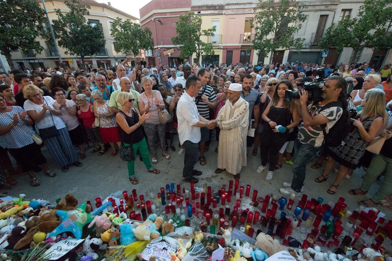 Un cop acabat l’acte, la família del petit Xavi i el representant de la mesquita de Rubí s’han acostat plegats a l’espai de la plaça on s’acumulen des de fa dies flors, espelmes i peluixos en record de les víctimes per dipositar-hi dos rams.