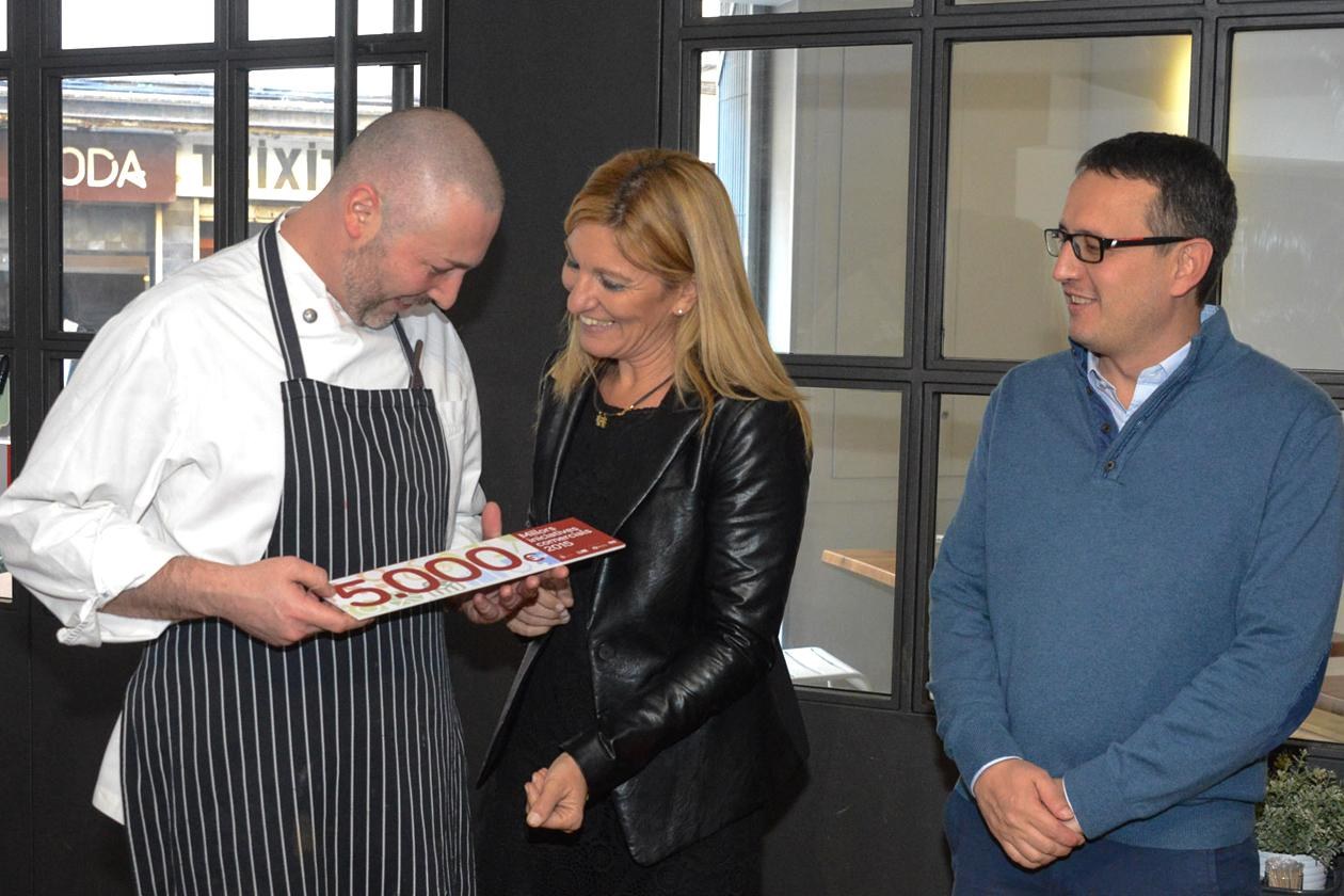 L’alcaldessa i el regidor de comerç entregant el xec de 5.000 euros al xef del  restaurant Cal Canalla, un dels establiments reconeguts l’any passat (foto: Localpres).
