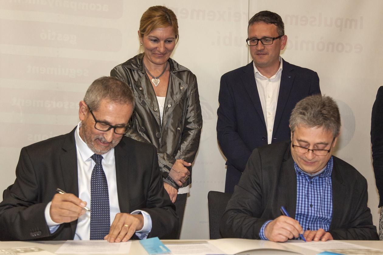 Manel Jiménez y Miquel Ortuño durante la firma del convenio con la presencia de la alcaldesa y el regidor de comercio (foto: Localpres).