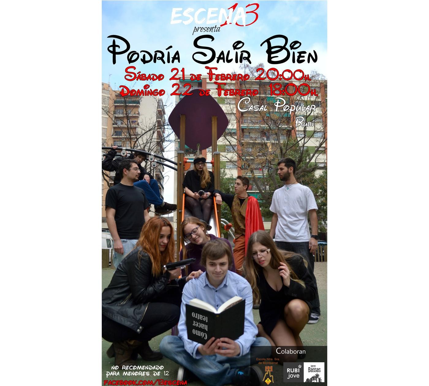 El grupo teatral Escena 13, con el apoyo del Espai Jove Torre Bassas y la colaboración de la Escola Nostra Senyora de Montserrat, representará el montaje Podría salir bien en el Casal Popular de Rubí el sábado 21 de febrero (20 h) y el domingo 22 de febrero (18 h). Se trata de un show formado por pequeñas obras de diferentes géneros y estilos, que la entidad teatral presenta con un tono irónico e imaginativo.